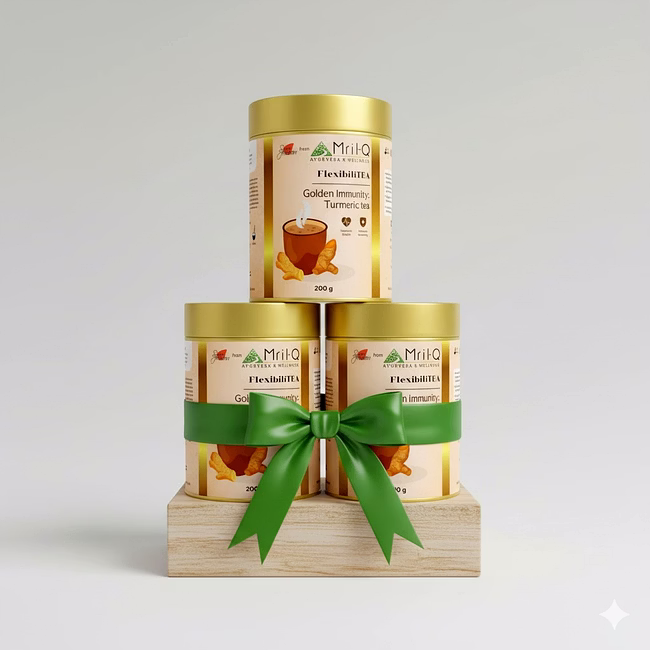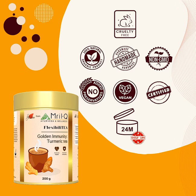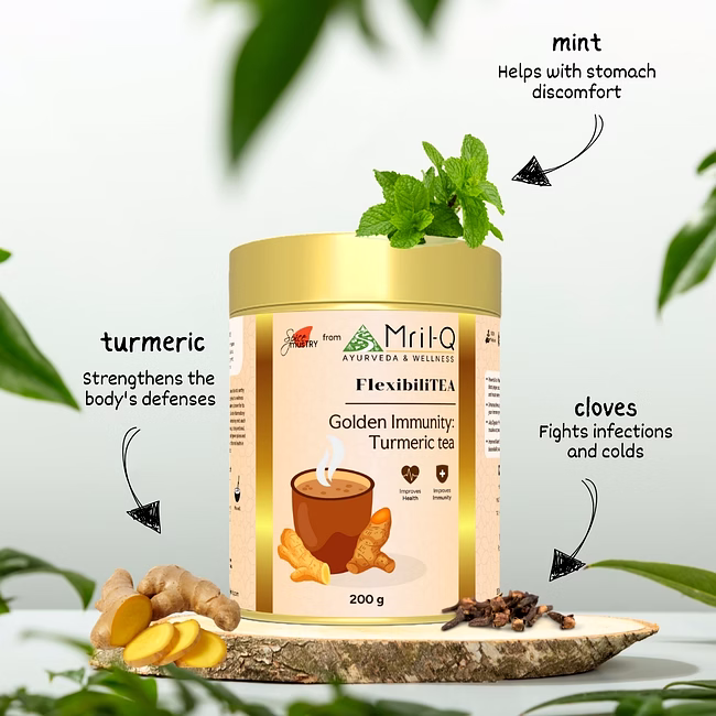 Enhance your wellness with MRILQ's FlexibiliTEA, a potent turmeric drink that bolsters immunity, fights inflammation, and aids digestion. Crafted with GI-tagged turmeric and a blend of herbal spices.