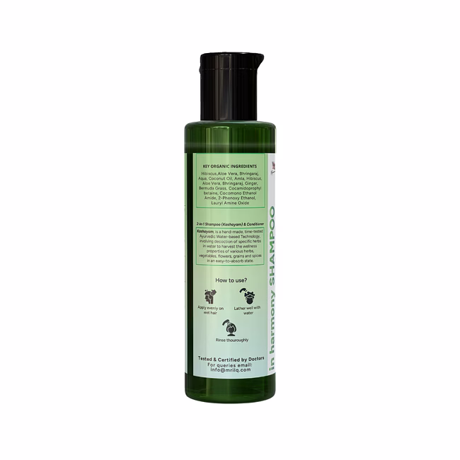 Ingredients simplified: Aqua, Coconut Oil, Amla, Hibuscus, Aloe Vera, Bhringaraj, Basil oil, Lemongrass, Bermuda Grass, Cocamidoprophyl betaine, Cocomono ethanol amide, Alpha Olefin Sulfonate, 2-Phenoxy ethanol, Lauryl amine oxide