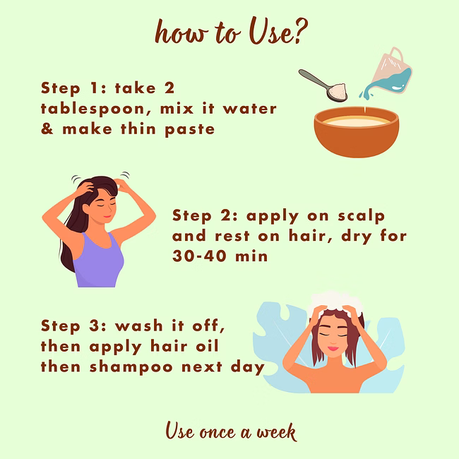 Step 1: Take two or three teaspoons of the mask, mix with adequate water to make a thin paste and apply on the scalp, once a week.